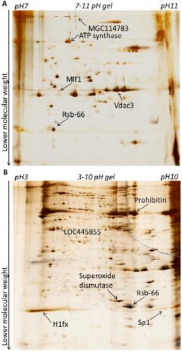 Figure 3. Silver staining of 2D-DIGE gels for spot excision. Gels from Figure 2 were silver-stained to allow protein visualisation and spot excision. Protein examples from Figure 2 are also indicated with arrows. (A) proteins separated in pH 7–11; (B) proteins separated in pH 3–10.