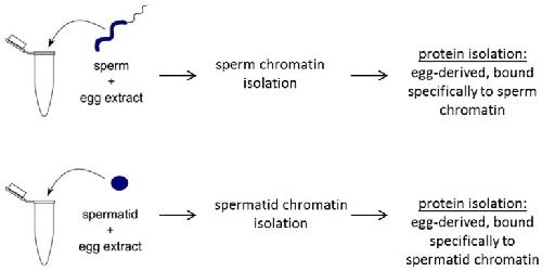 Figure 4. Schematic diagram showing experimental design for mass spectrometry analysis of extract-treated sperm or spermatids. Sperm or spermatids are separately treated with egg extracts. Subsequently, sperm or spermatid chromatin is purified and chromatin-bound proteins are isolated. Isolated proteins are then subjected to 2D-DIGE and mass spectrometry identification.