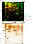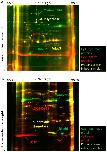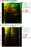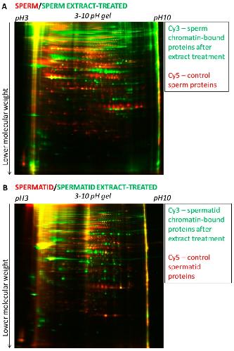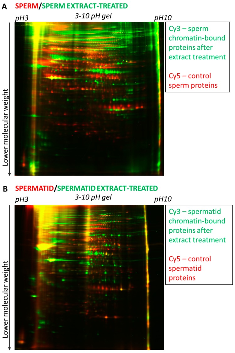 Figure 5. 2D-DIGE electrophoresis of proteins from sperm and sperm-extract treated and of spermatid and spermatid-extract treated. (A) Proteins isolated from sperm (red) were run on 2-D gel together with proteins bound to the sperm chromatin after egg extract treatment (green); (B) Proteins isolated from spermatid (red) were run on 2-D gel together with proteins bound to the spermatid chromatin after egg extract treatment (green). Note the presence of numerous red or green spots on both gels (A,B) and the low number of yellow spots. The first dimension electrophoresis for both gels shown was carried in the pH 3–10 (broad range).