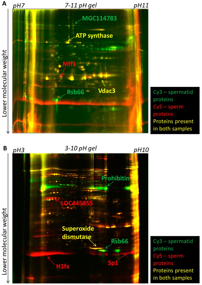 Figure 2. 2D-DIGE electrophoresis of proteins isolated from sperm and spermatids. Proteins isolated from spermatids and sperm were labelled with Cy3 (green) and Cy5 (red) dyes, respectively, and subsequently separated in two dimensions. Examples of sperm- and spermatid-specific proteins identified are indicated with arrows: red arrows for sperm-specific proteins and green arrows for spermatid-specific proteins. (A) Laser scanned image of a gel with the proteins separated in pH range 7–11 (basic range); (B) Laser scanned image of gel with proteins separated in the pH range 3–10 (broad range).