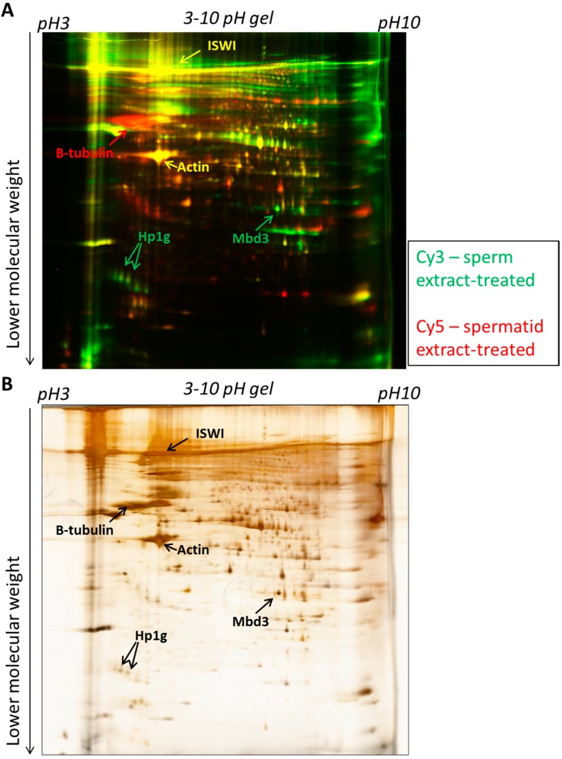 Figure 6. 2D-DIGE electrophoresis of sperm-extract treated and spermatid-extract treated. (A) Proteins bound to sperm chromatin after egg extract treatment (green) were run on a pH 3–10 gel together with proteins bound to spermatid chromatin after egg extract treatment (red). Examples of proteins binding specifically to sperm (green), spermatid (red) or to both types of cells (yellow) are indicated with arrows; (B) The same gel as in (A) silver-stained to allow protein spot visualisation and excision. Examples of proteins are indicated with arrows.