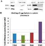 Figure 7. Validation of mass spectrometry results by immunoblotting. (A) Immunoblotting results on proteins isolated from sperm and spermatids after extract treatment. “sperm”—proteins bound to sperm chromatin after egg extract treatment; “spermatid”—proteins bound to spermatid chromatin after egg extract treatment. The antibody used is indicated on the left hand side of the blot inset. 6 µg of protein lysate was loaded on each lane; (B) Quantification of the blots shown in (A). Results are shown as fold difference between the band intensity in sperm-extract treated to spermatid extract-treated. Names of the proteins are indicated below the x axis.