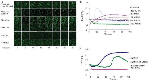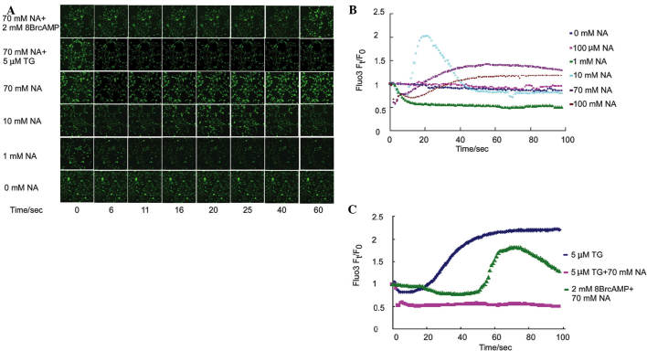 Figure 1. Time lapse assessment of intracellular [Ca2+] levels upon exposure to different concentrations of NA. (A) Visualization of intracellular [Ca2+] upon exposure to different concentration of nicotinic acid and other drugs by staining with Fluo3 acetoxymethyl Ca2+ indicator; (B) time lapse statistical curve of intracellular Ca2+ levels upon exposure to different NA concentrations; (C) TG inhibits the elevation of [Ca2+] induced by NA (pink curve) and cAMP analog 8-Br-cAMP delays and alleviates NA-induced primary [Ca2+] decrease (yellow curve). F0: Fluo3-labeled intensity prior to exposure to NA or other drugs; Ft: Fluo3-labeled intensity at time-point t. NA, nicotinic acid; TG, thapsigargin.
