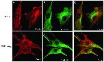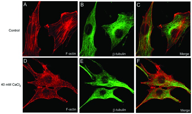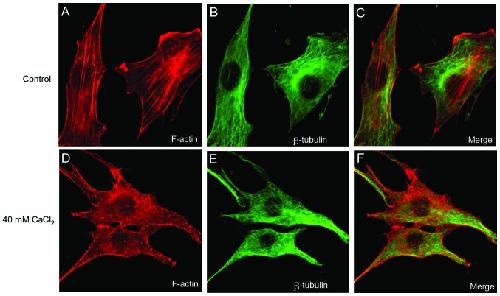 Figure 3. External addition of CaCl2 to the culture media and 1 h incubation disrupted the F-actin filaments, stained with Texas Red-X phalloidin, but did not affect the microtubules, stained with fluorescein isothiocyanate-conjugated antibody. (Magnification, ×250).