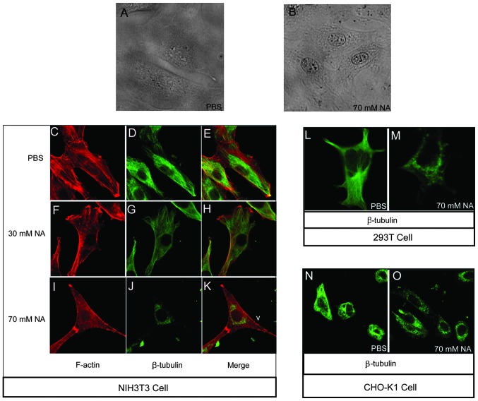 Figure 2. NA disassembles the cytoskeleton and deposits opaque materials at the peri-nuclear region. Compared with (A) the PBS-incubated control group, (B) 70 mM NA results in evident nucleolar accumulation of opaque materials at peri-nucleus regions in NIH3T3 cells. In the PBS-incubated NIH3T3 cells, (C) F-actin and (D) microtubules are filament-rich as is apparent in (E) the merged image. Exposure to 30 mM NA for 1 h partially disassembled (F) F-actin and (G) microtubules as is apparent in (H) the merged image. 70 mM NA completely disassembled (I) F-actin and (J) microtubules as apparent in (K) the merged image. Microtubule structure was disassembled when exposed to 70 mM NA for 1 h in both (L and M) 293T cells and (N and O) CHO-K1 cells. (Magnification, ×250). NA, nicotinic acid.