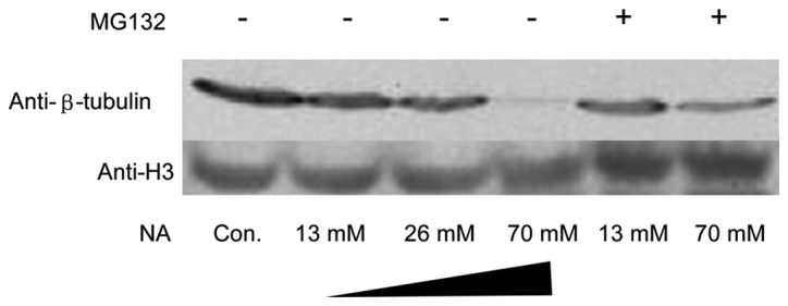 Figure 4. NA caused microtubule component β-tubulin degradation in an ubiquitin-proteasome pathway. NA, nicotinic acid.