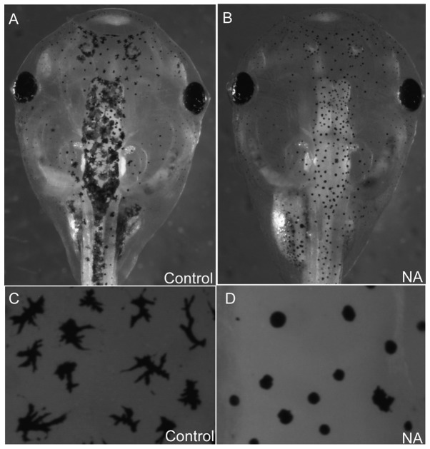Figure 5. Microinjection of 70 ng NA into xenopus embryos inhibited the melanosome transport. NA, nicotinic acid. (Magnification, ×30).