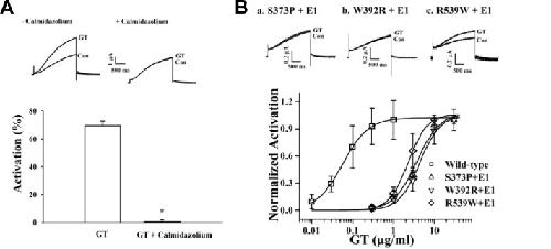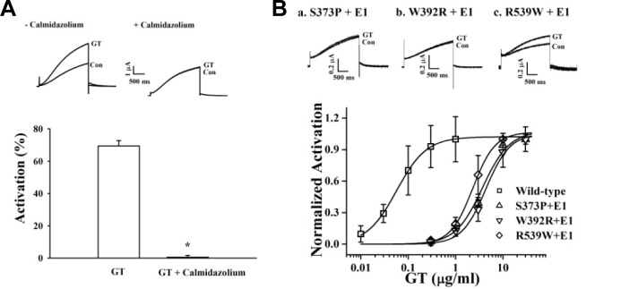 Fig. 4. Involvement of CaM in gintonin-mediated IKs channel activation. (A) Oocytes expressing IKs channels were incubated in the absence or presence of calmidazolium (1.5 μM) for 10 min. Insets, the representative gintonin-mediated mediated peak outward current amplitude at +30 mV from a holding potential of −80 mV was measured in the absence or presence of calmidazolium. Summary histograms show peak outward IKs channel currents recorded in the absence or presence of calmidazolium (mean ± S.E.M; n = 13–14 oocytes each; *P < 0.001, compared to gintonin alone). (B) Oocytes expressing IKs channels mutated at the Ca2+/CaM-binding sites (S373P, W392R, or R539W) were treated with gintonin for 60 s. Mutation of Ca2+/CaM-binding sites resulted in a rightward shift of the gintonin concentration-response curve (mean ± S.E.M; n = 10–12 oocytes each). Insets, the representative peak outward current amplitude at +30 mV from a holding potential of −80 mV was measured in the presence of gintonin. Gintonin-mediated peak outward IKs channel currents recorded in oocytes expressing mutant channels were significantly attenuated (mean ± S.E.M; n = 10–12 oocytes each; *P < 0.001, compared to the wild type).