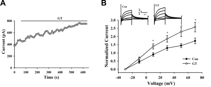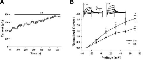 Fig. 6. Gintonin increases IKs of guinea pig ventricular myocytes. (A) Time course of changes in the amplitude of the IKs tail during applications of gintonin (3 μg/ml). (B) I–V relationships obtained before and after application of gintonin. Currents were elicited by voltage steps from −30 mV to +70 mV with a subsequent step to −30 mV for the tail current. Representative recordings are shown in the inset. Data are represented as mean ± S.E. (n = 8). *p < 0.05 versus control condition (paired t test)