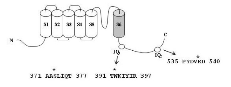 Fig. 1. Schematic of the human KCNQ1 subunit topology showing amino acidmutations. (A) A sequence alignment of the KCNQ1 channel protein and the amino acid residues that were mutated CaM-binding sites IQ1 (373, 392) and IQ2 (539).