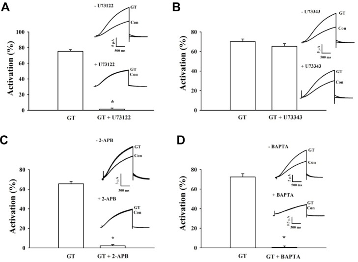 Fig. 3. Signal transduction pathways of gintonin-mediated IKs channel activation. (A, B) Representative recordings of IKs (A) channel currents following application of gintonin (GT) for 30 s in the presence of U73122, an active PLC inhibitor. U73343, an inactive PLC inhibitor, in oocytes expressing IKs channels. Inset, the representative peak outward current amplitude at +30 mV from a holding potential of â80 mV was measured in the presence of gintonin. The active or inactive PLC inhibitor was pretreated for 5 min before gintonin application. (C, D) Time-current relationship after application of gintonin (GT) for 30 s in the presence of 2-APB, an IP3 receptor antagonist, or BAPTA-AM, a membrane permeable Ca2+chelator, in oocytes expressing IKs channels. Inset, the representative peak outward current amplitude at +30 mV from a holding potential of â80 mV was measured in the presence of gintonin. The application of 2-APB or BAPTA preceded the gintonin application by 2 h. Summary histograms show the peak outward IKs channel currents (mean ± S.E.M; n = 13-14 oocytes each) recorded in oocytes expressing the IKs channel in the absence or presence of the indicated agents (*P < 0.001, compared to gintonin alone).