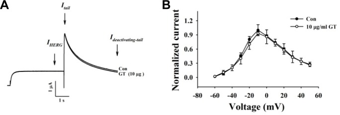 Fig. 5. Effects of gintonin on IhERG, Itail, and slow Ideactivating-tail. (A) Representative current trace showing hERG K+ channel enhancement by gintonin (10 μg/ml). Currents were in response to 4-s voltage steps to 0 mV from a holding potential of −90 mV, followed by repolarization to −60 mV. (B) I–V relationship for hERG K+ currents measured at the end of the 4-s test pulse before and after application of 10 μg/ml gintonin (n = 5). Currents were normalized to the control current at 0 mV for each oocyte. Data are represented as mean ± S.E.M. (n = 7).