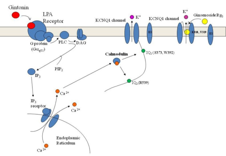 Fig. 8. Diagram comparing gintonin- and ginsenoside Rg3-mediated activation of the IKs channel. Gintonin-mediated IKs activation proceeds via Ca2+/CaM binding to IQ motifs via G protein-coupled LPA1 receptors, whereas ginsenoside Rg3 activates IKs through a direct interaction with specific amino acids located at the pore entryway of channel proteins following depolarization (Choi et al., 2010).
