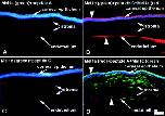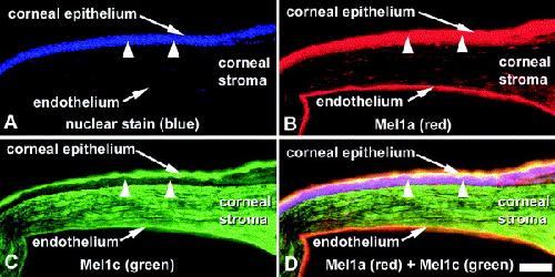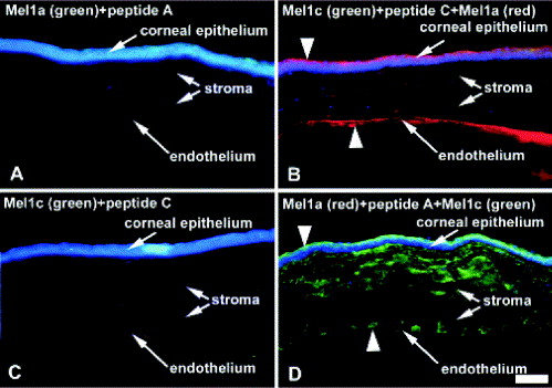 Peptide block controls for Mel1a and Mel1c labelling in the Xenopus laevis cornea. (A and C) Corneal sections were incubated with green fluorescent dye conjugated Mel1a or Mel1c receptor antibodies previously pre-incubated with their corresponding peptide and were counterstained with DAPI blue nuclear dye. Absence of green stain indicates complete block of specific antibody binding with specific peptide. (B and D) Corneal sections were incubated with red fluorescent dye-conjugated Mel1a receptor antibody together with green fluorescent dye n conjugated Mel1c receptor antibody previously pre- incubated with either Mel1a or Mel1c peptide and counterstained with DAPI blue nuclear dye. Red labelling indicates areas of specific Mel1a receptor labelling in epithelium and green labelling indicates areas of specific Mel1c receptor labelling in surface epithelium, endothelium (arrowheads) and stroma. Scale bar=100 μm.