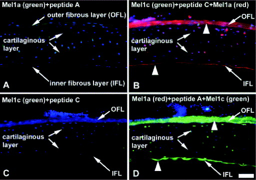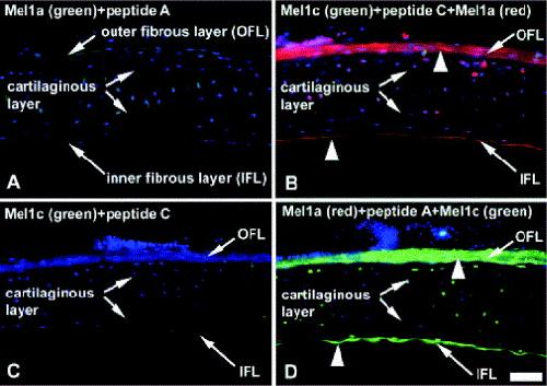 Peptide block controls for Mel1a and Mel1c labelling in the Xenopus laevis sclera. (A and C) Scleral sections were incubated with green fluorescent dye conjugated Mel1a or Mel1c receptor antibodies previously pre- incubated with their corresponding peptide and were counterstained with DAPI blue nuclear dye. Absence of green stain indicates complete block of specific antibody binding with specific peptide. (B and D) Scleral sections were incubated with red fluorescent dye-conjugated Mel1a receptor antibody together with green fluorescent dye conjugated Mel1c receptor antibody previously pre-incubated with either Mel1a or Mel1c peptide and counterstained with DAPI blue nuclear dye. Red labelling indicates areas of specific Mel1a receptor labelling in outer and inner fibrous layers (OFL and IFL; arrowheads) as well as in the cartilaginous layer and green labelling indicates areas of specific Mel1c receptor labelling in outer and inner fibrous layers (OFL and IFL; arrowheads) and in the cartilaginous layer. Scale bar=100 μm.