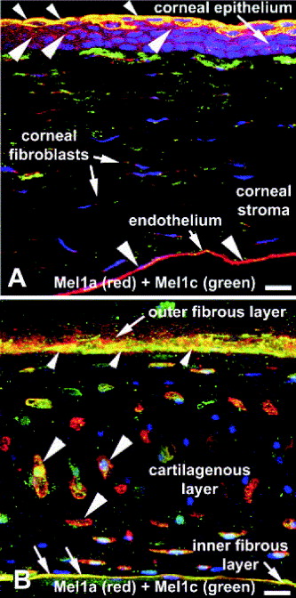 The scornea and sclera have been shown to exhibit circadian rhythms in cellular proliferation, wound healing and extracellular matrix synthesis. The distribution of melatonin Mel1a and Mel1c receptors was examined in the cornea and sclera of the Xenopus laevis eye in order to determine whether melatonin may potentially influence the growth and/or development of these ocular tissues. Sections of adult X. laevis eyes were analyzed by immunocytochemistry and confocal microscopy, using antibodies prepared against specific peptide sequences of the Xenopus Mel1a and Mel1c receptor proteins. Antibodies were pre- incubated with their appropriate antigenic peptides to control for non-specific labelling. Analysis of the distribution of Mel1a and Mel1c receptor immunoreactivity in the Xenopus eye revealed that both the Mel1a and Mel1c receptors were located in the outer fibrous layer (OFL) of the sclera, with Mel1c labelling being the most prominent. Similarly, Mel1a and Mel1c (Mel1c mostly) were also located in cells of the inner fibrous layer (IFL) with Mel1c being most abundant. The chondrocytes of the cartilaginous layer also appeared to express Mel1a, Mel1c, or both receptors. Both Mel1a and Mel1c receptor immunoreactivity were observed in the corneal epithelium and endothelium. Whereas the Mel1a antibody labelled the entire corneal epithelial layer, the Mel1c antibody labelled only the most superficial layer of epithelial cells. Cell processes of fibroblasts of the corneal stroma were immunoreactive for either Mel1a or Mel1c receptors. The identification of Mel1a and Mel1c receptors in restricted distributions in the cornea and sclera suggests that melatonin may play a role in the cellular physiology of these ocular tissues.