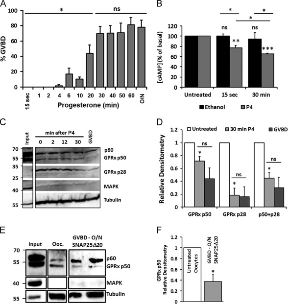 Fig. 3. Endogenous GPRx internalizes in response to progesterone treatment. A) Percentage of oocytes reaching the GVBD stage following different exposure times to P4 ranging from 15 s to overnight (O/N). Data from 6 donor females. B) cAMP levels in oocytes untreated oocytes and oocytes exposed to either P4 or the carrier control ethanol for 15 s or 30 min. Data are normalized to untreated oocytes C-E) Oocytes were treated with P4 for 0, 2, 12, 30 min and overnight (C); or overnight with SNAP25δ20 (E). Membrane proteins were biotinylated and purified as described in materials and methods. Whole lysates (2 oocytes) and biotinylated membrane proteins were examined by western blotting for the indicated antigens. D-F) Densitometry analyses on Western blots as in panel C and E. GPRx-p28 and/or p50 band intensity was normalized to tubulin. Data are normalized to untreated oocytes. All data are shown as means±s.e.m., âp<0.05, ââp<0.001, âââp<0.0001, ns, not significant, when compared to control or as indicated by the bar.