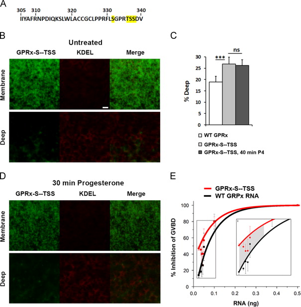 Fig. 5. GPRx endocytosis is required for progesterone-induce maturation. A) GPRx C-terminus amino acids sequence, the S-TSS residues are highlighted in yellow. B/C/D) Oocytes were injected with GPRx-SâTSS (10 ng RNA/cell) and KDEL-mCherry (20 ng RNA/cell) and were imaged 48 h later. B/D) Representative images from the cell membrane focal plane or a deep cytoplasmic focal plane are shown from untreated oocytes (B) and from oocytes exposed to P4 for 30 min (D). The scale bar is 2 μm. C) Percentage of intracellular GPRx-SâTSS before and 30 min after P4 (24 oocytes) and compared to intracellular wild-type GPRx (wt untreated; 61 oocytes). E) Oocytes were injected with increasing amounts of RNA coding for wild-type GPRx or the SâTSS mutant and the percent inhibition of maturation was measured after normalization to the maturation rate in untreated oocytes. All data are shown as means±s.e.m., ââp<0.001, ns, not significant, when compared to control or as indicated by the bar.