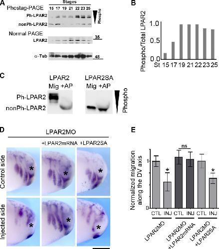 Figure 2. LPAR2 phosphorylation is required for in vivo NC migration. (A) Western blot of whole LPAR2 with Phos-tag PAGE showing that the phosphorylated forms of LPAR2 (Ph-LPAR2) become predominant at the onset of NC migration (stage 19). nonPh-LPAR2, nonphosphorylated LPAR2; α-Tub, α-Tubulin. (B) Normalized ratio of PhoshoLPAR2 and Phospho+nonphosphoLPAR2. The experiment was done four times. A representative gel and a representative graph showing the ratio of Phospho-LPAR2/Total LPAR2 are depicted in A and B, respectively. (C) Western blot of control (LPAR2) or point mutation S324A LPAR2 (LPAR2SA) cytoplasmic tail with Phos-tag PAGE. Alkaline phosphatase (+AP) treatment allows visualization of the non-phosphorylated bands. (D) Embryos injected with LPAR2MO or coinjected with LPAR2MO and 5 mismatch (5 mm) LPAR2 mRNA or 5 mmLPAR2SA mRNA. A mixture of FoxD3 and Dlx2 probes (which labels premigratory as well as migratory NC cells) was used to visualize the whole NC population. Asterisks indicate eyes. (E) Quantification of NC migration from embryos shown in D (18 embryos were analyzed). One-way ANOVA, P = 0.0025. Individual comparisons: *, P < 0.05. Error bars indicate SD. |