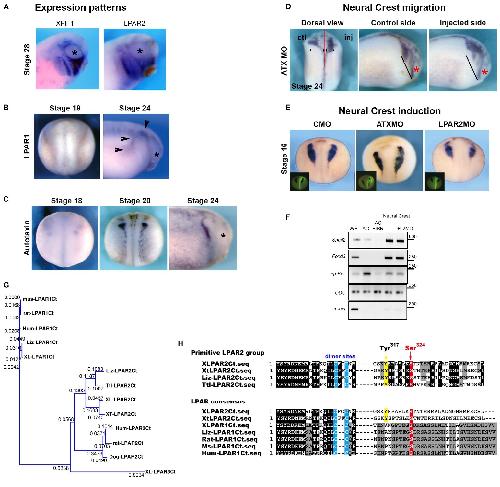 Figure S1. LPAR2 and Autotaxin are required for NC migration. (A) Lateral view of XFli1 (NC marker) and LPAR2 expression at postmigration stages. (B) Expression of LPAR1 in premigratory (stage 18, dorsal view) and migratory stages (stage 24, lateral view). Arrowheads indicate the otic vesicle and an ectodermal domain that appears to be expressing LPAR1. No expression was seen in NC cells. (C) Expression of Autotaxin at stage 18 and 20 (dorsal views) and stage 24 (lateral view). ATX is first weakly expressed in the neural plate border region (St18) and is up-regulated in early migratory NC cells (St20), and remains expressed in a subpopulation of migratory NC cells (St24). Asterisks indicate eyes. (D) Inhibition of ATX expression impairs NC migration (St24, dorsal and lateral views). (E) Inhibitions of ATX or LPAR2 expressions do not affect NC induction (St18, Snail2 in situ hybridization; the inset shows FDx on the injected side). (F) RT-PCR from RNA extracts obtained from whole embryos (WE), animal caps (AC), animal caps expressing truncated BMP receptor (AC + tBR), or from NC cells obtained from animal caps coexpressing tBR and Wnt8, in the presence of LPAR2MO (L2MO). Snail2 and Foxd3 are NC markers. Asterisks mark the eye. (G and H) Sequence analyses of LPAR2 and LPAR1. (G) Evolutional tree (NJ method; GENETYX) of LPARâs seventh cytoplasmic domain amino acid sequences (C-tail). LPAR2 sequences are categorized into two groups, relatively primitive animals (lizard, turtle, frogs) and mammalian homologues (human, rat, mouse, dog), whereas the sequence homologies of LPAR1 are very high in C-tail among species. Right panel, multiple sequence alignments of LPARs. Among the primitive species, Tyr317, Ser318, Ser321, and Ser324 are well-conserved. (H) We compared LPAR2 and LPAR1 sequences to generate a LPAR consensus sequence in which S324 is well conserved across species. |