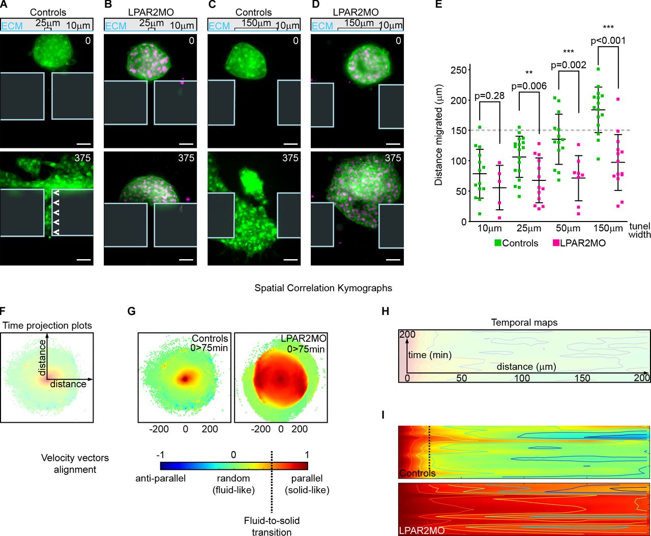 Figure 4. LPAR2 signaling is required for solid-likeâtoâfluid-like transition during NC EMT. (AâD) Invasion assay with microfluidic tunnels. Bars, 50 µm. (E) Quantification of invasion assay (19 10-µm explants from seven independent experiments; Studentâs two-tailed t test: P = 0.279; 31 25-µm explants from nine independent experiments; Studentâs two-tailed t test: P = 0.006; 22 50-µm explants from seven independent experiments; Studentâs two-tailed t test: P = 0.0018; 29 150-µm explants from eight independent experiments; Studentâs two-tailed t test: P < 0.001). (FâI) Spatial correlation kymographs. Projection of all time points (F) or temporal maps (H) where each line corresponds to a mean of three consecutive time points. Hot colors indicate a high level of correlation between two compared velocity vectors. (G) Comparison of correlation kymographs projections between control (left) and LPAR2MO (right). (I) Comparison of correlation kymographs over time between control (top) and LPAR2MO (bottom) cells. The broken line in the control data indicates at which distance between cells correlation is lost. That represents the threshold of solid-likeâtoâliquid-like behavior transition. |