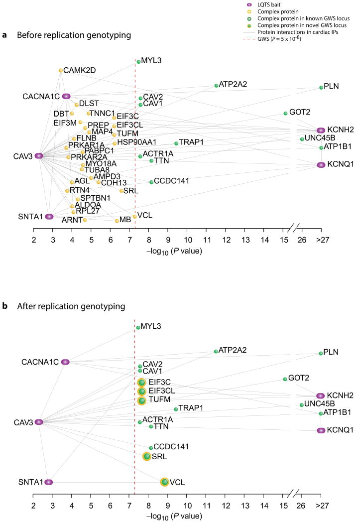 Genome-wide association studies (GWAS) have identified thousands of loci associated with complex traits, but it is challenging to pinpoint causal genes in these loci and to exploit subtle association signals. We used tissue-specific quantitative interaction proteomics to map a network of five genes involved in the Mendelian disorder long QT syndrome (LQTS). We integrated the LQTS network with GWAS loci from the corresponding common complex trait, QT-interval variation, to identify candidate genes that were subsequently confirmed in Xenopus laevis oocytes and zebrafish. We used the LQTS protein network to filter weak GWAS signals by identifying single-nucleotide polymorphisms (SNPs) in proximity to genes in the network supported by strong proteomic evidence. Three SNPs passing this filter reached genome-wide significance after replication genotyping. Overall, we present a general strategy to propose candidates in GWAS loci for functional studies and to systematically filter subtle association signals using tissue-specific quantitative interaction proteomics.