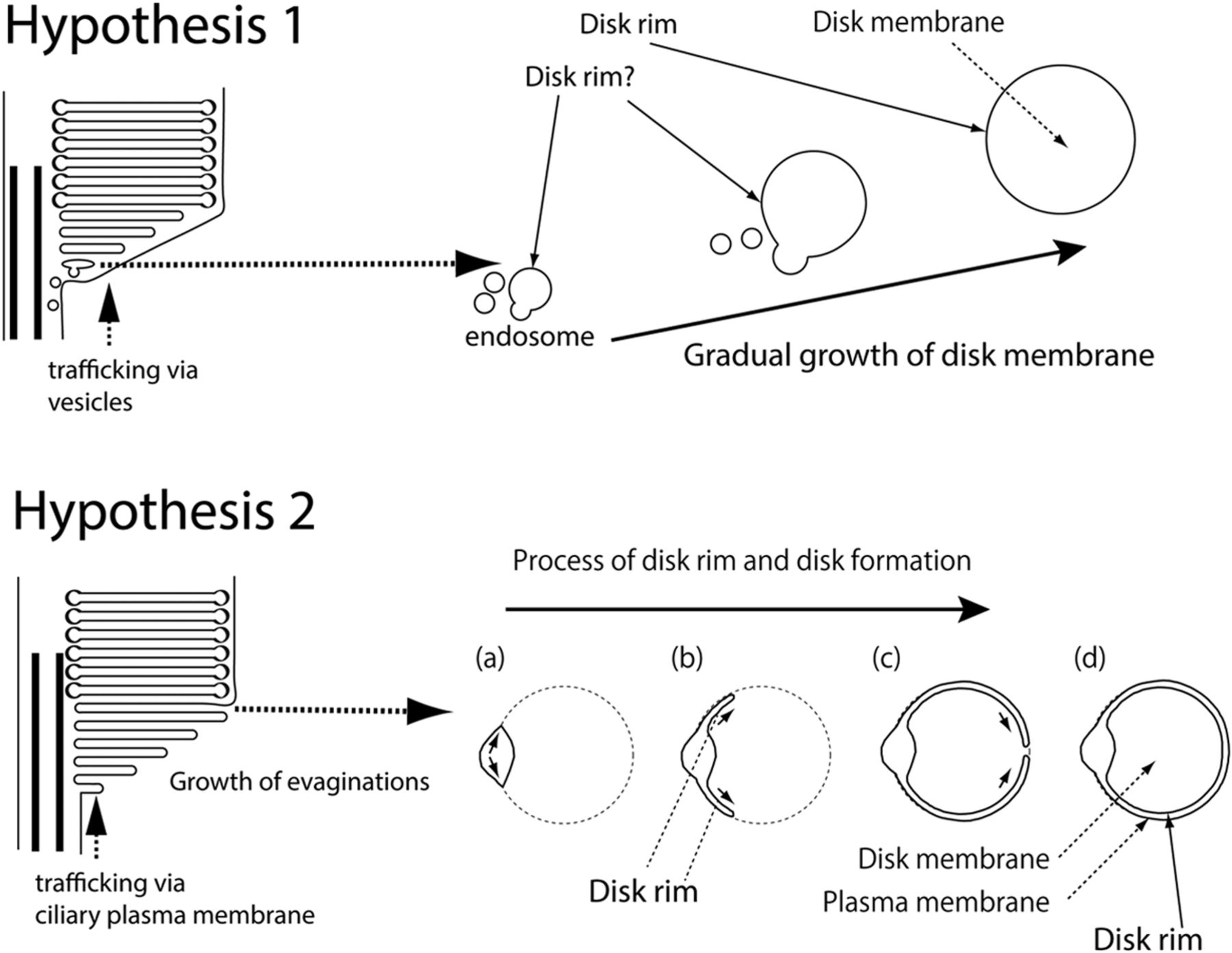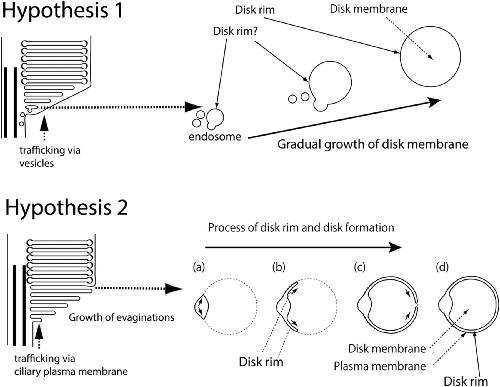 Models for disk membrane morphogenesis. Hypothesis 1: In the endosome model, disk membranes are formed by multiple endosomes fusing to grow into larger disks (Miyaguchi and Hashimoto, 1992; Obata and Usukura, 1992; Chuang et al., 2007). It is unclear when and how the disk rim is formed and if immature disks have rim regions. PM and disk membrane renewal are not necessarily synchronized. Hypothesis 2: In the evagination model, disk membranes are formed by initial PM evagination, which then becomes sealed to generate closed and mature disks (Steinberg et al., 1980). The sealing also results in the generation of the disk rim and the new PM domain.