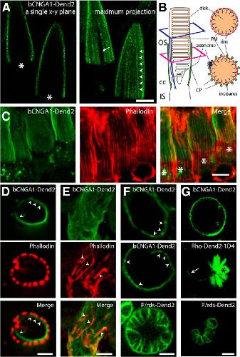 bCNGA1-Dend2 localizes to the PM of the rod OS. A, The localization of bCNGA1-Dend2 in X. laevis rods. B, Xenopus rod photoreceptor cell: the connecting cilium (CC) connects the IS and OS. Disks are located in the OS, and surrounded by the PM; CNGA1 localization is denoted by the dashed red lines. CâE, Phalloidin-stained bCNGA1-Dend2 transgenic Xenopus retina indicates the CPs are enriched with F-actin filaments (red). CPs do not contain bCNGA1-Dend2 (green). E, Retinas from bCNGA1-Dend2 transgenic tadpoles were pretreated with neutral protease dispase and BAPTA to partially destroy CPâOS connections (arrowheads). F, The localization of bCNGA1-Dend2 (top and middle) in PM and peripherin/rds-Dend2 (P/rds-Dend2, bottom) in disk rims and incisures of X. laevis rods. The middle represents the region transecting axoneme, around which bCNGA1-Dend2 is absent. G, Localization of bCNGA1-Dend2 in PM (top), rhodopsin-Dend2â1D4 (Rho-Dend2â1D4) in PM (arrow) and disks (asterisk; middle), and peripherin/rds-Dend2 (P/rds-Dend2) in disk rims (bottom) in hypotonically lysed retinas. Images are maximum projections of optical slices (A, right, C, E) or single confocal images (A, left, D, F, G). Images are either from live and unfixed retina (A); fixed retina (CâF); or hypotonically lysed, unfixed retina (G). Images (D) and (F) were processed by 2D blind deconvolution, to deblur the images and to reveal bCNGA1-Dend2-enriched structures (arrowheads). Animals were 14 d old. Scale bars: A, C, E, G, 5 μm; D, F, 2 μm.