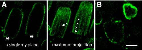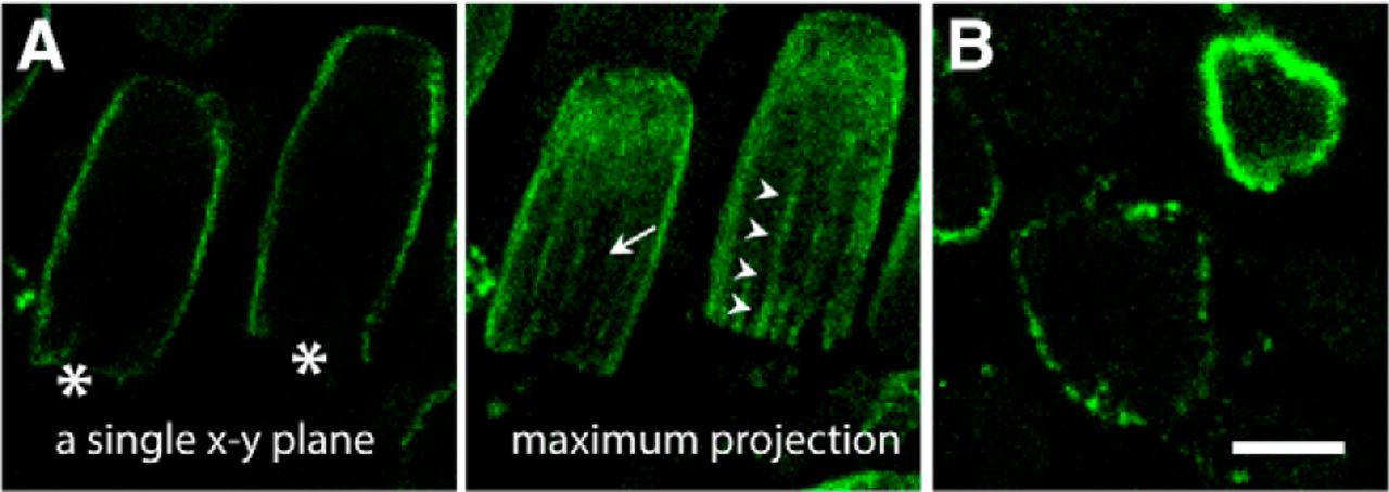 OS PM localization of endogenous X. laevis CNGA1. The localization of endogenous X. laevis CNGA1 in intact OS PM (A) and hypotonically lysed OS PM (B). Images are obtained from methanol/DMSO-fixed retina (A) or hypotonically lysed and 4% formaldehyde-fixed retina (B). Animals were 14 d old. Scale bar, 5 μm.