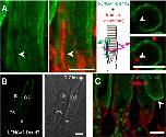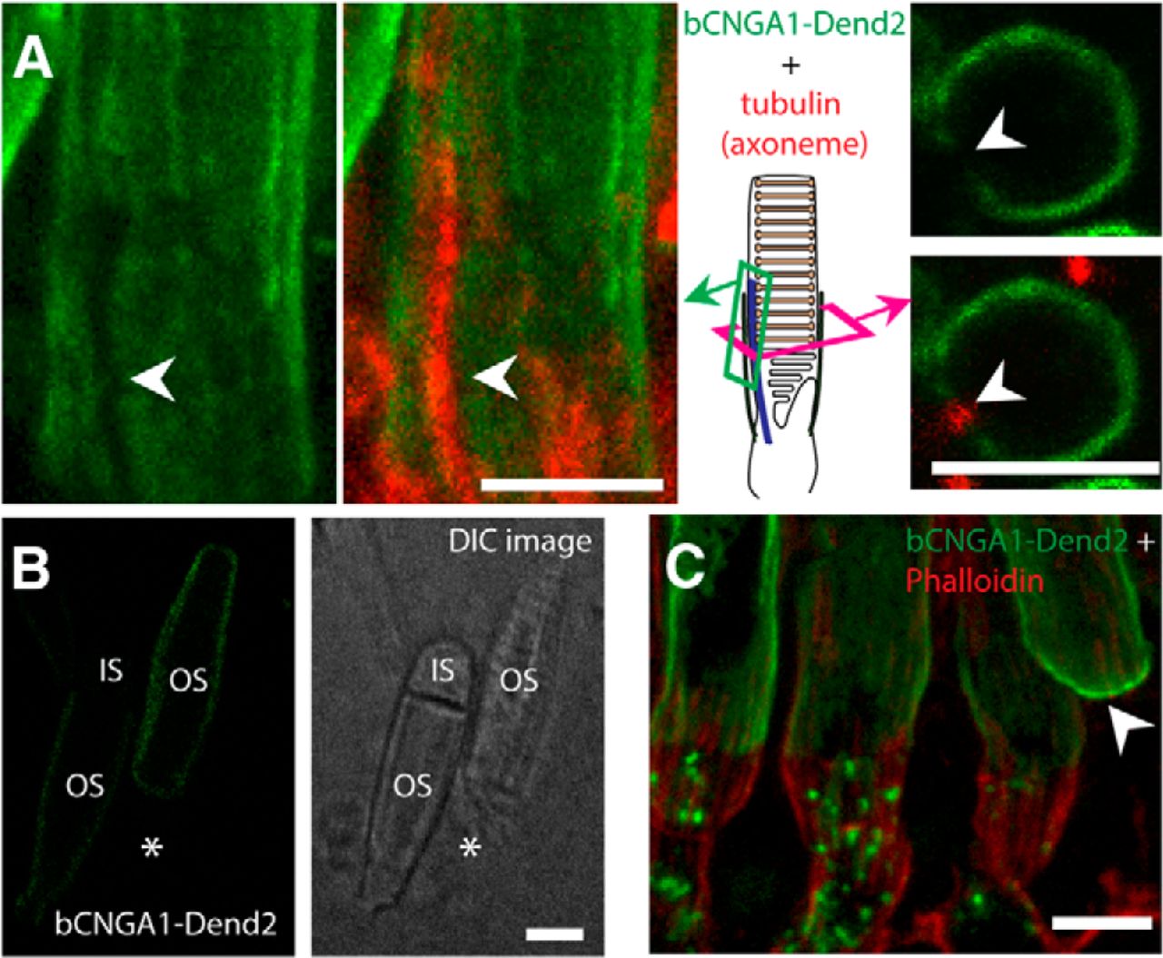 bCNGA1-Dend2 is excluded from the PM domains proximal to the axoneme and at the bottom of OS. A, bCNGA1-Dend2 does not localize in the proximity of the axoneme (arrowheads); bCNGA1-Dend2 (green) was colabeled with anti-acetylated tubulin (red). B, C, The localization of bCNGA1 in the rod cells with and without IS, respectively. bCNGA1-Dend2 localization forms an aberrant closed shape (B, left, asterisk) only in the OS detached from the IS as revealed by DIC image (B, right, asterisk). In C, F-actin was labeled with fluorescent phalloidin (red) to reveal IS structures, which are not attached to OS with aberrant localization of bCNGA1-Dend2 (arrowhead). Images are either from fixed retina (A, C) or live and unfixed retina (B). Animals were 14 d old. Scale bars: 5 μm.
