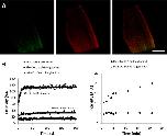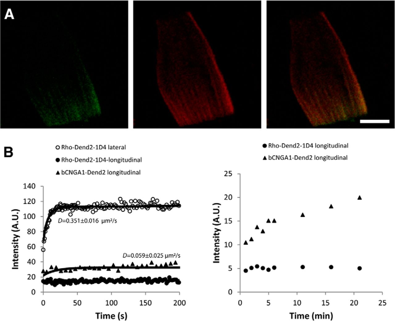 bCNGA1-Dend2 mobility in the PM of the rod OS. A, The photoconversion technique allows discrimination of old (red) from newly synthesized (green) bCNGA1-Dend2. Forty-eight hours after photoconversion, newly added bCNGA1-Dend2 was concentrated at the basal portion of the rod OS where newly formed disk membranes are added (Lodowski et al., 2013). Images are from live and unfixed retina. Scale bar, 5 μm. B, Lateral and longitudinal diffusion of rhodopsin-Dend2–1D4 and longitudinal diffusion of bCNGA1-Dend2 were studied by FRAP in X. laevis rods. FRAP measurements were corrected and fitted to curves to estimate the diffusion coefficients (D) and percentage of immobile fraction as described in Materials and Methods. A.U., arbitrary units.