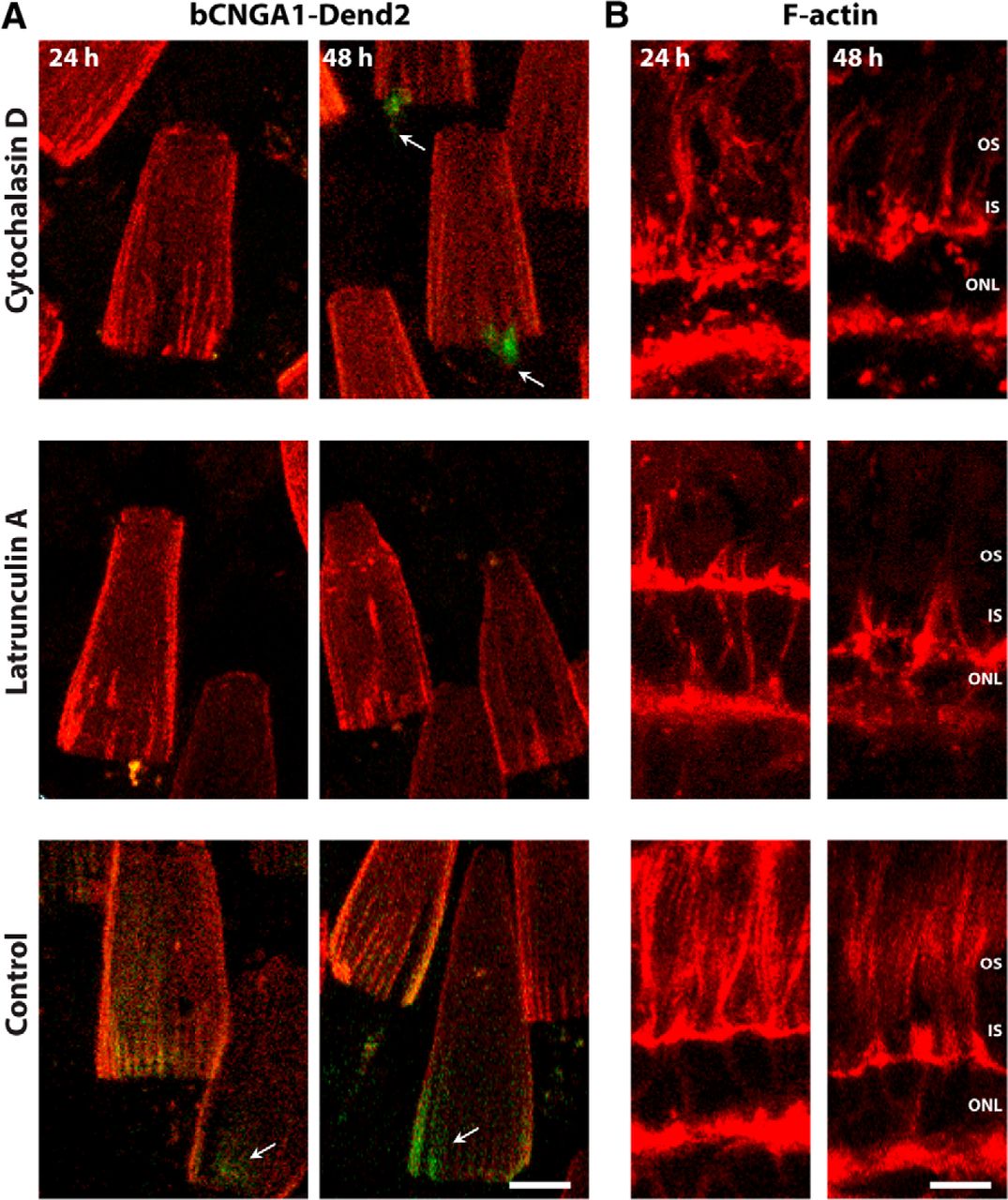 Entrance of bCNGA1-Dend2 to the rod OS PM is F-actin dependent. A, Localization of old (red) and newly synthesized (green, arrows) bCNGA1-Dend2 after cytochalasin D, latrunculin A, or DMSO (vehicle control) treatment for 24 and 48 h. B, Cytochalasin D and latrunculin A disrupt F-actin filaments. Animals were 14 d old at the time of photoconversion. Images are either from live and unfixed retina (A) or fixed retina (B). ONL, outer nuclear layer. Scale bars: 5 μm.