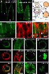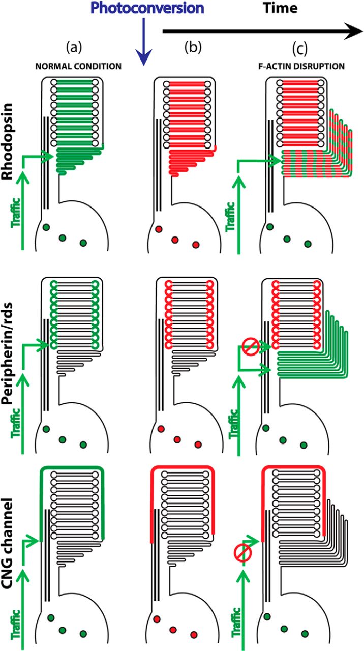 Differential targeting of rhodopsin, peripherin/rds, and CNG channel to the OS compartments. Schematic showing the summary of photoconversion experiments in this study. a, Disk (rhodopsin), disk rim (peripherin/rds), and PM (CNG channel) protein trafficking in rod photoreceptor cell. According to the evagination hypothesis, rhodopsin is trafficked to evaginations, whereas peripherin/rds is not. CNG channels are incorporated into the OS PM as disk membranes are formed. Proteins are trafficked from the IS to the OS. b, Photoconversion turns Dend2 fusion proteins from green to red. This conversion is irreversible, and thus old proteins stay red. c, After F-actin disruption, rhodopsin-Dend2–1D4 and peripherin/rds-Dend2 are trafficked to the evagination overgrowths, while trafficking of the bCNGA1-Dend2 to the OS PM is inhibited. The presence of old and photoconverted rhodopsin-Dend2–1D4 in the evagination indicates that the evagination was the original destination of rhodopsin-Dend2–1D4 (compare b and c). The lack of old and photoconverted peripherin/rds-Dend2 in the evagination indicates that the evagination was not the original destination (compare b and c).