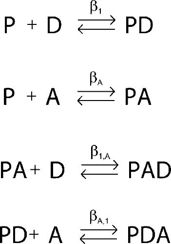 Scheme 1. ISWI (P) Binding to DNA (D) and the Nucleotide Analogue (A)β1, βA, β1,A, and βA,1 represent