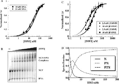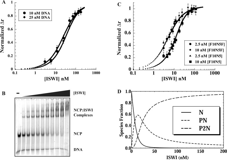 (B) Fluorescence anisotropy measurements (Δr) of equilibrium binding of ISWI to Alexa488-labeled 10N18 nucleosomes