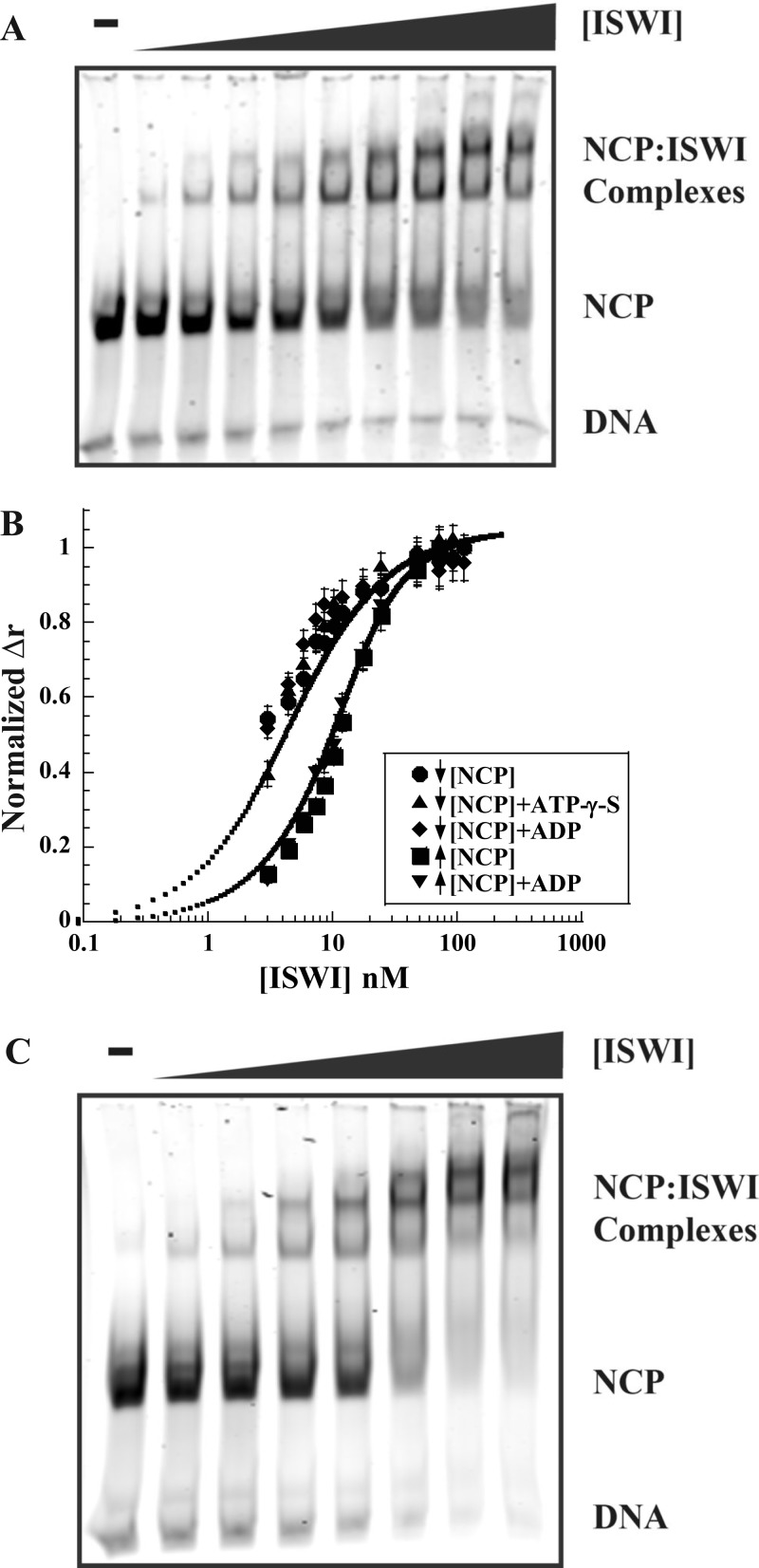Quantitative determination of binding of ISWI to nucleosomes and DNA shows allosteric regulation of DNA binding by nucleotides.