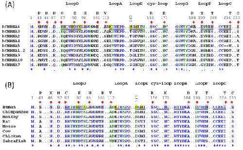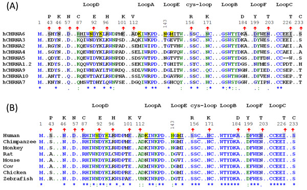 Figure 1. Localizations of N-terminal variations to primary/secondary structure of nAChR hα6 subunits. (A) Degree of conservation of variant residues in nAChR hα6 subunit in relation to other human nAChR α subunits: Human nAChR α subunits (α1-α7, α9 and α10) are aligned using ClustalW. Indicated residues in nAChR hα6 subunits undergoing variation are fully (Asp92 and Ser156), strongly (Arg87 and Asn171) and weakly (Asp57, Asp199 and Asn203) conserved in human nAChR α subunits. Some of the variations in nAChR hα6 subunit are localized to indicated loop regions: Ala112Val (loop A), Ala184Asp (loop B), Ile226Thr (loop C), Asp92Glu (loop D), Asp199Tyr (loop F) and Asn203Thr (loop F) and Asn171Lys (cysteine-loop). (B) Degree of conservation of variant residues in nAChR hα6 subunit in relation to nAChR α6 subunits from other organisms: nAChR α6 protein sequences extracted from (GenBank) NP_067344.2 (Mouse), NP_004189.1 (Human), NP_990695.1 (Chicken), NP_476532.1 (Rat), NP_001029266.1 (Chimpanzee), XP_001099152.1 (Monkey), XP_584902.3 (Cow) and NP_001036149.1 (Zebrafish) are aligned by using ClustalW. For both (A) and (B); numbering begins at translation start methionine of nAChR hα6 subunit and is shown in the regions of interest. However, only segments of the alignment are presented to identify WT nAChR hα6 subunit AA residues (shaded, upward arrow mark and numbers above them) and their corresponding variations (noted above the numberings). Symbols below sequences indicate fully (*), strongly (:) or weakly (.) conserved residues: hα6 subunit AA residues at positions 87 (Arg), 92 (Asp), 156 (Ser) and 171 (Asn) are conserved in both human nAChR α subunits and nAChR α6 subunits of other organisms. Also shown (shaded) are the nAChR hα6 subunit residues including the loop E residue N143 that alone or in combination Met145 influences the function of hα6*-nAChRs [26].