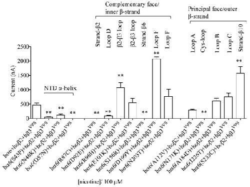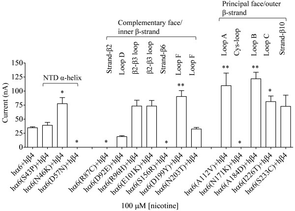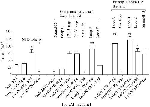 Figure 5. Variations in nAChR hα6 subunit influence the current responses of hα6hβ4-nAChRs. Mean (±SE) peak inward current responses upon exposure to 100 μM nicotine (5 sec exposure; ordinate) are estimated from oocytes (n = 6-9) voltage clamped at −70 mV and heterologously expressing the indicated nAChR subunits. Oocytes coexpressing hα6A184D (variation in loop D) and hβ4 subunits yield largest current responses to 100 μM nicotine. Comparisons of peak current responses between control (hα6hβ4-nAChR) and variant groups were analyzed using one-way ANOVA with Dunnett’s multiple comparisons test (*, p < 0.05; and **, p < 0.01).