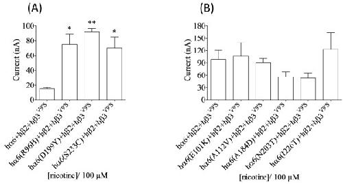 Figure 3. Variations in nAChR hα6 subunit influence the current responses of human α6β2β3V9’S-nAChRs expressed in oocytes using codon optimized nAChR hβ2 subunits. Mean (±SEM) peak inward current responses upon exposure to 100 μM nicotine (5 sec exposure; ordinate) are estimated from oocytes (n = 3-7) voltage clamped at −70 mV and heterologously expressing the indicated nAChR subunits. Current responses of hα6hβ2hβ3V9’S-nAChR are completely abolished (D57N or S156R), partially abolished (S43P, N46K, R87C, D92E or N171K), not changed (E101K, A112V, A184D, N203T or I226T) and increased (R96H, D199Y or S233C) as a result of the indicated variations in nAChR hα6 subunits. Oocytes coexpressing nAChR hα6(D199Y) subunits, codon optimized hβ2 subunits and hβ3V9’S subunits yield largest current responses to nicotine. Comparisons of peak current responses between control (hα6hβ2hβ3V9’S-nAChR) and variant nAChR groups were analyzed using one-way ANOVA with Dunnett’s multiple comparisons test (*, p < 0.05; and **, p < 0.01).