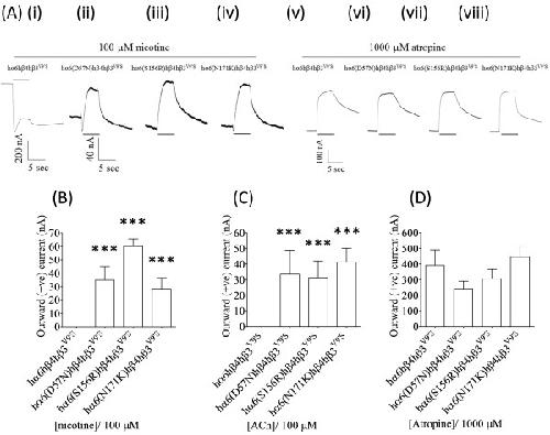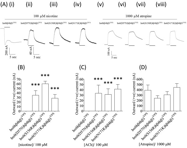 Figure 7. Nicotinic agonists act as antagonists at hα6(D57N, S156R or N171K)hβ4hβ3V9’S-nAChRs. (A) Representative traces are shown for inward or outward current responses from oocytes (voltage clamped at -70 mV) responding to the application of indicated concentrations of nicotine or atropine (shown with the duration of drug exposure as black bars above or below the traces) and expressing hα6hβ4hβ3V9’S- [(A) (i) and (v)], hα6D57Nhβ4hβ3V9’S-[(A) (ii) and (vi)], hα6S156Rhβ4hβ3V9’S[(A) (iii) and (vii)] or hα6N171Khβ4hβ3V9’S- [(A) (iv) and (viii)] nAChRs. Calibration bars are for 200 (i), 40 [(ii), (iii) and (iv)] or 100 [(v), (vi), (vii) and (viii)] nA currents (vertical) or 5 sec (horizontal). Results for these and other studies were used to estimate mean (±SE) peak outward current responses to 100 μM nicotine (B), 100 μM ACh (C) or 1000 μM atropine (D) from oocytes (n=3-6) heterologously expressing the indicated nAChR subunits. hα6(D57N,S156RorN171K)hβ4hβ3V9’S-nAChRs elicit outward (positive) current in response to nicotine (B) or ACh (C) which is completely absent from hα6hβ4hβ3V9’S-nAChRs [(B) and (C)]. hα6(D57N,S156RorN171K)hβ4hβ3V9’S-nAChRs in rare occasion display minuscule inward currents in response to ACh or nicotine (data not shown). Comparisons between groups were analyzed using one-way ANOVA with Tukey’s post hoc comparison and only those differ from the control (hα6hβ4hβ3V9’S-nAChR) are marked with asterisks. ***; p < 0.001.
