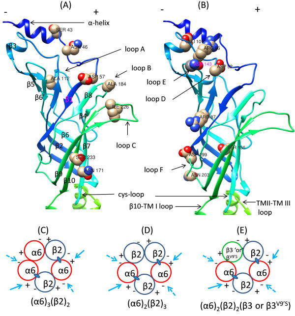 Figure 2. Localizations of AA variations to secondary structures and interfaces of nAChR hα6 subunit. [(A) and (B)] AA residues undergoing variation are identified in a 3D model of the nAChR hα6 subunit: A 3D homology model of the nAChR hα6 subunit was generated based on the crystal structure of Torpedo muscle nAChR α subunit (PDB code: 2BG9:A). Hence structural features are approximate and may deviate from what seen with α subunit of Torpedo muscle nAChR. β strands constitute inner β-sheet (strand β1-β3, β5, β6 and β8) and outer β-sheet (strand β4, β7, β9 and β10); and are connect to each other via loops. These loops constitute positive (+) (loops A, B and C) and negative face (loops D, E and F) of α6 subunit and contribute to subunit assembly, ligand binding, and formation of ligand binding pocket and/or coupling agonist binding to channel gating. Cysteine loop and other loop residues undergone variations are also identified. [(C)-(E)] Interfaces contributed by α6 subunit to formation of α6*-nAChR: Adhering to the canonical rule of pentamer formation, α6β2-nAChR would be formed out of three α6 and two β2 subunits [i.e., (i) (α6)3(β2)2-nAChR] or two α6 and three β2 subunits [i.e., (ii) (α6)2(β2)3-nAChR]. In the event β3 or gain-of-function β3 (i.e., β3V9’S) subunits to be integrated into α6β2*-nAChR complexes these subunits would take the position of 3rd α6 subunit in the 1st (i) configuration or 3rd β2 subunit in the 2nd (ii) configuration [i.e., (iii) (α6)2(β2)2(β3or β3V9’S)-nAChR]. Similarly, β4 subunit would substitute β2 subunit for formation human α6β4-[i.e., (α6)3(β4)2 and (α6)2(β4)3]-nAChR. For formation of (α6)2(β4)2β3- or (α6)2(β4)2β3V9’S-nAChR β3 or β3V9’S subunits would substitute one α6 subunit in (α6)3(β4)2 configuration or one β4 subunit in (α6)2(β4)3 configuration. Two presumed agonist (ACh or nicotine and others) binding sites in the interface of α6(+) and β2(−) subunits are identified as ovals. Variations in the structural loops in the (−)-ve face (loop D, E and F) and (+)-ve face (loop A, B and C) of the hα6 subunit are expected to affect the function of hα6*-nAChRs involving interfaces identified by arrow marks.