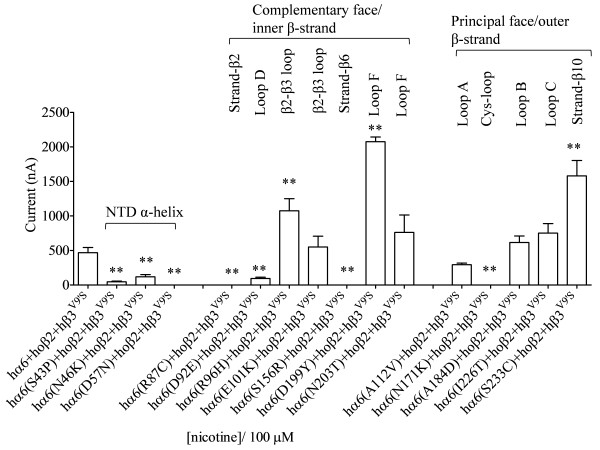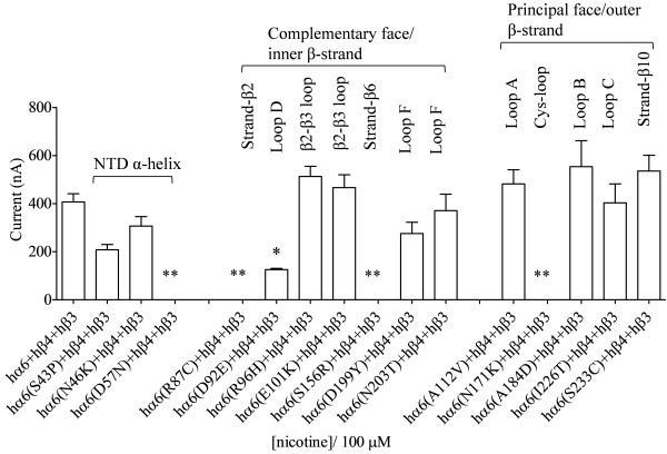 Figure 6. Variations in nAChR hα6 subunit influence the current responses of hα6hβ4hβ3-nAChRs. Mean (±SE) peak inward current responses upon exposure to 100 μM nicotine (5 sec exposure; ordinate) are estimated from oocytes (n = 6-11) voltage clamped at −70 mV and heterologously expressing the indicated nAChR subunits. Oocytes coexpressing hα6(D57N, R87C, S156R or N171K) subunits plus hβ4 and hβ3 subunits do not yield current responses to nicotine though those coexpressing hα6, hβ4 and hβ3 subunit yield fairly robust current responses. hα6 subunit variation Asp92Glu (in loop D) partially abolishes the peak current responses of hα6hβ4hβ3-nAChRs. hα6 subunit variations Asn46Lys, Arg96His, Glu101Lys, Ala112Val, Ala184Asp, Asn203Thr, Ile226Thr or Ser233Cys do not affect nicotine elicited peak current responses of hα6hβ4hβ3-nAChRs. Comparisons between control (hα6hβ4hβ3) and variant groups were analyzed using one-way ANOVA with Dunnett’s multiple comparisons test (*, p < 0.05; and **, p < 0.01).