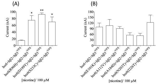 Figure 4. Variations in nAChR hα6 subunit influence the current responses of human α6β2β3V9’S-nAChR expressed in oocytes using WT nAChR hβ2 subunits. Attempts were made to verify the results obtained for human α6β2β3V9’S-nAChR using WT nAChR hβ2 subunits instead of codon optimized hβ2 subunits. Mean (±SEM) peak inward current responses upon exposure to 100 μM nicotine (5 sec exposure; ordinate) are estimated from oocytes (n = 3-7) voltage clamped at −70 mV and heterologously expressing the indicated nAChR subunits. (A) Oocytes coexpressing nAChR hα6(R96H, D199Y or S233C), hβ2WT and hβ3V9’S subunits yield current responses to nicotine that are higher than those expressing nAChR hα6, hβ2WT and hβ3V9’S subunits. These results are in agreement with those obtained using codon optimized hβ2 subunits. (B) Initial recordings 3 days after cRNA injection indicated that oocytes expressing WT hα6 or variant hα6(E101K, A112V, A184D, N203T or I226T) subunits along with WT hβ2 and hβ3V9’S subunits yield ~10-30 nA of current in response to 100 μM nicotine [see the hα6hβ2hβ3V9’S-nAChR response in (A)]. However recordings done after 2 additional days of waiting indicated that nicotine elicited current responses from human α6E101Kβ2β3V9’S-, α6A112Vβ2β3V9’S-, α6A184Dβ2β3V9’S-, α6N203Tβ2β3V9’S- or α6I226Tβ2β3V9’S-nAChRs are equal (p > 0.05) to those obtained from human α6β2β3V9’S-nAChRs. These results are in agreement with those obtained using codon optimized hβ2 subunits. Comparisons between groups were analyzed using one-way ANOVA with Tukey’s post hoc comparison and only those differ from the control (hα6hβ2hβ3V9’S-nAChR) are shown with asterisks. *, p < 0.05; and **, p < 0.01.