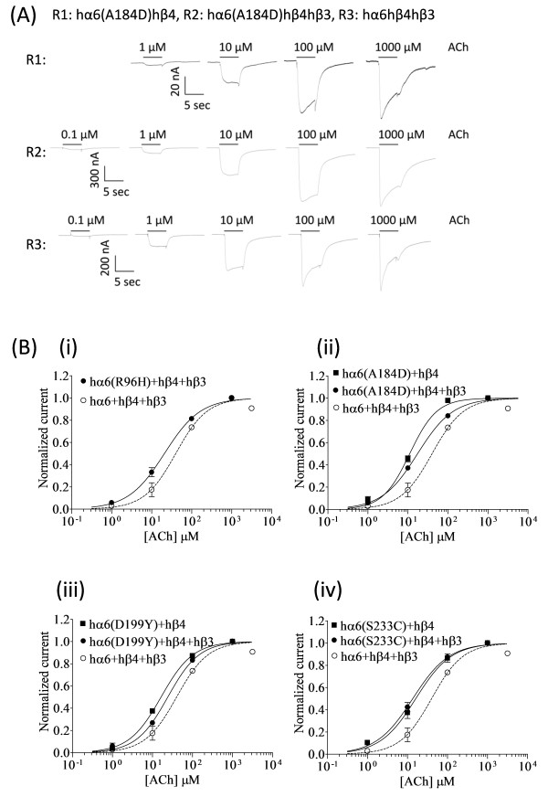 Figure 8. Variations in nAChR hα6 subunit influence the ACh sensitivity of hα6hβ4*-nAChRs. (A) Representative traces are shown for current responses from oocytes (voltage clamped at −70 mV) responding to the application of indicated concentrations of ACh (shown with the duration of drug exposure as black bars above the traces) and expressing indicated nAChR (i.e., R1: hα6A184Dhβ4-nAChR, R2: hα6A184Dhβ4hβ3-nAChR, R3: hα6hβ4hβ3-nAChR]. (B) Results averaged across experiments were used to produce concentration-response (CR) curves (ordinate-mean normalized current ± SEM; abscissa - ligand concentration in log μM) for inward current responses to ACh as indicated for the nAChR expressed in oocytes and voltage clamped at −70 mV. Current amplitudes are represented as a fraction of the peak inward current amplitude in response to the most efficacious concentration of ACh. Leftward shifts in ACh CR curves for hα6R96Hhβ4hβ3-(●) [(B) (i)], hα6A184Dhβ4hβ3-(●) [(B) (ii)], hα6D199Yhβ4hβ3-(●) [(B) (iii)], or hα6S233Chβ4hβ3-(●) [(B) (iv)] nAChR are evident relative to that of hα6hβ4hβ3-nAChR (○). Furthermore ACh curves for hα6A184Dhβ4-(■) [(B) (ii)], hα6D199Yhβ4-(■) [(B) (iii)], or hα6S233Chβ4-(■) [(B) (iv)] nAChR are shifted leftward relative to those nAChR containing the same subunits but in the additional presence of hβ3 subunits. See Table 3 for parameters of ACh action.