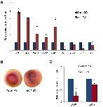3. Validation of xbra and other genes affected by ext1 knockdown. (A) Selected genes identified by microarray were validated using Q-RT-PCR. Embryos injected with 20 ng of EXT1 MO or EXT1 MIS were collected at stage 10.5 for RNA extraction and Q-RT-PCR. (B) In situ hybridization shows differences in xbra expression in control vs ext1 morphant embryos. Results are representative of over 2/3 of embryos from 3 independent experiments. (C) Q-RT-PCR assays for expression of the xbra target genes eFGF and Wnt11. Relative fold enrichment of each target gene was calculated after normalization with the housekeeping gene ornithine decarboxylase (ODC) using the δδCt method. Bars represent mean ± S.D. N=3 independent experiments. *: p < 0.05.