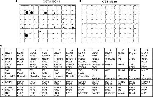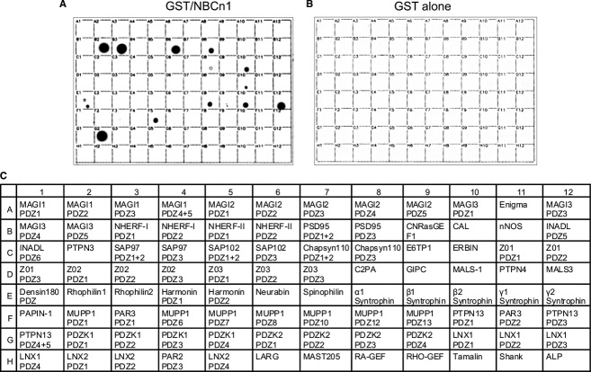 Figure 1. A proteomic analysis to identify PDZ proteins capable of binding to NBCn1. (A) A proteomic array containing 96 class I PDZ domains from 55 different proteins was screened with the C‐terminal domain of NBCn1 fused to GST. The domains bound to GST/NBCn1 were detected by the anti‐GST antibody. (B) The control experiment with GST only. (C) The PDZ domains spotted on the membrane are listed. The proteins binding to NBCn1 are MAGI‐3 (B2 in the array), NHERF‐1 (B3), NHERF‐2 (B6), PSD‐95 (B8), chapsyn‐110 (C8), ERBIN (C10), MALS‐1 (D10), densin‐180 (E1), syntrophins α1 (E8), β2 (E10), γ2 (E12), MUPP1 (F5), and PDZK1 (G2).