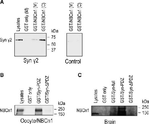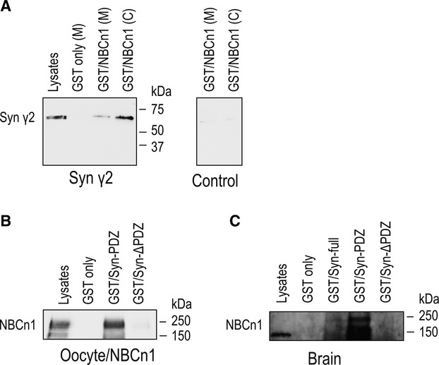 Figure 3. Interaction between NBCn1 and syntrophin γ2. (A) Lysates of Xenopus oocytes expressing syntrophin γ2 or none were incubated with GST/NBCn1 fusion proteins containing the C‐terminal amino acids of NBCn1. GST only served as a control. Pull‐down samples were immunoblotted with the syntrophin γ2 antibody. Syntrophin γ2 (60 kDa) was detected in pull–down samples from syntrophin γ2‐expressing oocytes, but not from control oocytes. Lysates were prepared from membrane (M) and cytosol (C). (B) Lysates of oocytes expressing rat NBCn1 were incubated with GST only, GST/Syn‐PDZ containing amino acid residues 1‐231 of syntrophin γ2, which include the PDZ domain, and GST/Syn‐ΔPDZ containing residues 232–539, which include the peckstrin homology domain. NBCn1 was pulled down by GST/Syn‐PDZ, but not by GST/Syn‐ΔPDZ. One of three experiments is shown. (C) Membrane lysates of rat brains were incubated with GST only, GST/Syn‐full containing the full‐length syntrophin γ2, GST/Syn‐PDZ, or GST/Syn‐ΔPDZ. NBCn1 was pulled down by GST/Syn‐full and GST/Syn‐PDZ, but not by GST/Syn‐ΔPDZ.