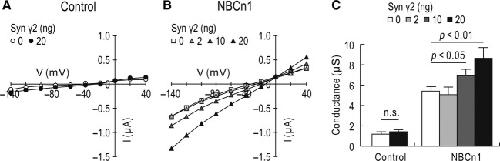 Figure 5. Effect of syntrophin γ2 on NBCn1 conductance. (A) Representative current–voltage (I–V) relationships in a syntrophin γ2‐expressing oocyte or an uninjected oocyte. Oocytes were clamped at −60 mV and subjected to the voltage command stepping from −140 to +40 mV. Steady‐state currents were recorded (n =5 for each). Recordings were done in HCO3−/CO2‐free ND96 solution. (B) I–V relationships in oocytes expressing NBCn1 and different amounts of syntrophin γ2. Large inward currents at negative potentials and outward currents at positive potentials are hallmarks for NBCn1 conductance. (C) Mean slope conductance. Slopes were determined near zero‐current voltages in I–V plots. Data were averaged from uninjected control oocytes (n =12), oocytes expressing syntrophin γ2 (n =16), NBCn1 (n =15), NBCn1 plus syntrophin γ2 at 2 ng (n =17), 10 ng (n =15), and 20 ng (n =24). n.s, not significant. P‐values were calculated to compare each NBCn1/syntrophin with NBCn1 only.