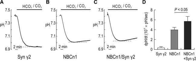 Figure 4. Effect of syntrophin γ2 on NBCn1‐mediated pHi recovery in Xenopus oocytes. (A–C) Representative pHi traces in oocytes expressing syntrophin γ2, NBCn1, and NBCn1/syntrophin γ2. Oocytes were superfused with HCO3−/CO2‐free ND96 solution and then with a solution equilibrated with 25 mmol/L HCO3−, 5% CO2. pHi was measured with a proton‐selective glass electrode. (D) Mean pHi recovery rate. The recovery rate (dpHi/dt) was calculated from a linear regression line during the first 2 min of recovery (n = 5 for each).