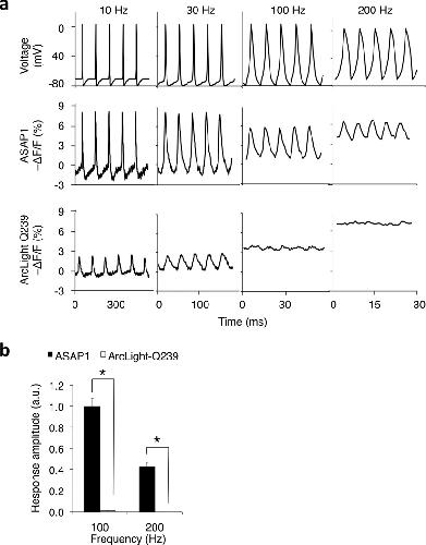 Figure 2. Monitoring simulated AP trains in voltage-clamped HEK293A cells. (a) ASAP1 followed 200-Hz trains of AP waveforms, while ArcLight Q239 followed trains of 30 Hz but not 100 Hz or 200 Hz. For each frequency, simulated trains of APs (2.0-ms FWHM, 75-mV peak amplitude) were applied for 1 second. Traces shown are the fluorescence response to 5 AP waveforms at 500 ms from the start of each train. (b) We quantified the frequency response of ASAP1 and ArcLight-Q239 to 100 Hz and 200 Hz simulated spike trains described above. We first estimated the power spectra density of the response using fast Fourier transforms. For 100 Hz trains, we quantified the amplitude of the power density peak at 100 Hz; correspondingly, we quantified the amplitude of the 200 Hz peak for 200 Hz spike trains. Consistent with subpanel (a) (bottom row) ArcLight Q239 produced little or no response at these frequencies, with mean peak amplitudes of 0.012 ± 0.001 (100 Hz) and < 0.001 (200 Hz). ASAP1 showed greater mean response amplitudes to both 100 Hz and 200 Hz simulated AP trains (100 Hz, p = 0.021; 200 Hz, p = 0.031). Differences are statistically significant following Holm-Bonferroni correction for multiple comparisons. For each train, n = 5 HEK293A cells per construct. Error bars, SEM.